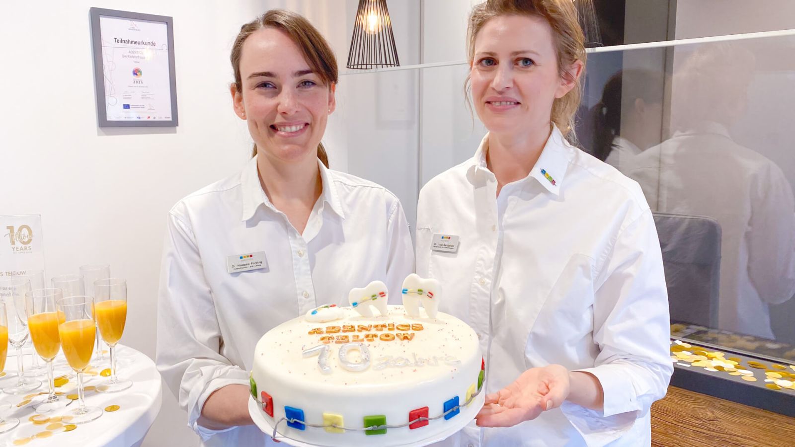 Ein besonderes Highlight waren die beiden Jubiläumstorten im ADENTICS-Stil, mit bunter Brackets-Dekoration und dem Namen des jeweiligen Standorts. Dazu gab es kleine Aufmerksamkeiten für unsere Patientinnen und Patienten.