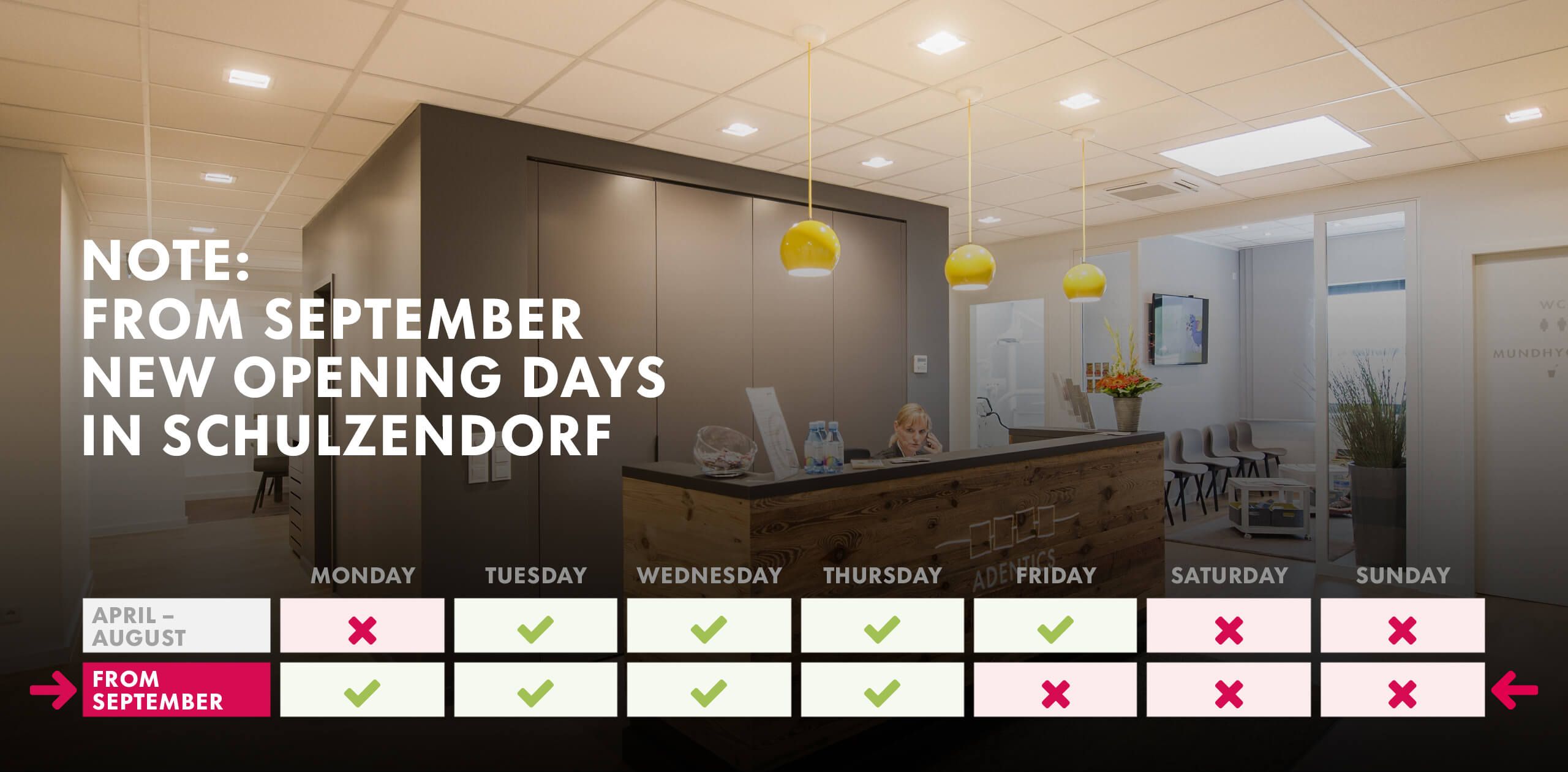 please note that we will return to our usual opening hours from Monday to Thursday from September in Schulzendorf.