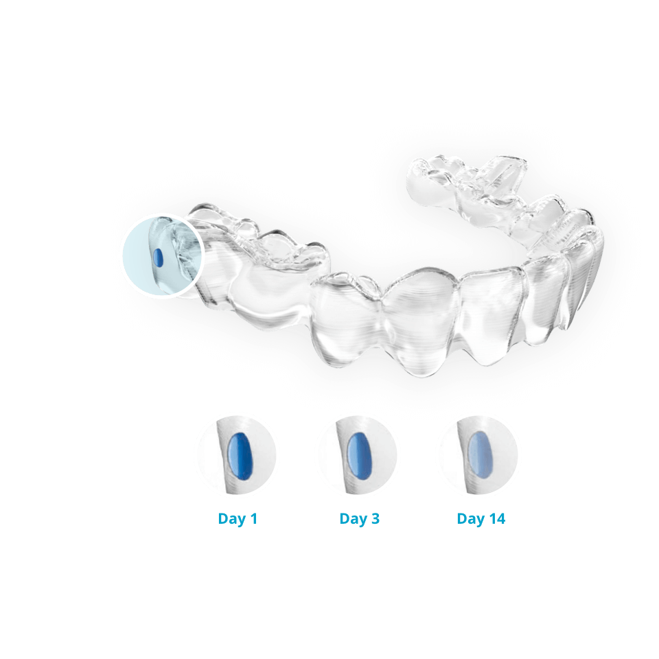 During the 2-week period in which the respective splint is used, the indicators show the wearing time of the aligners. The indicators gradually fade from blue to colorless. This allows you, your child and your orthodontist to estimate and also check the wearing duration.