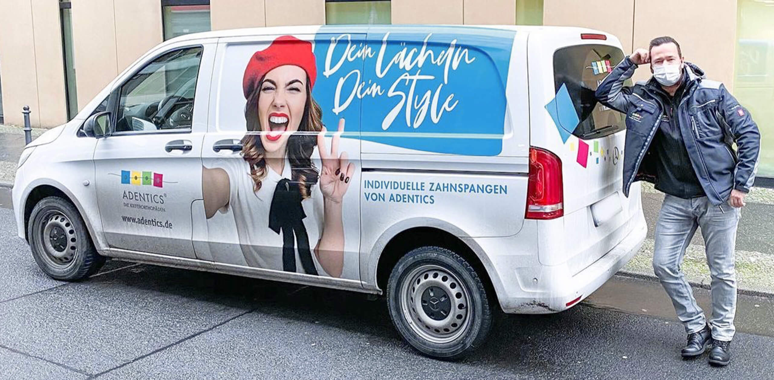 Unser Fahrer und Facility-Manager Stefan neben seinem Mobil. Er vernetzt und betreut regelmäßig alle 5 ADENTICS Standorte und Labore...