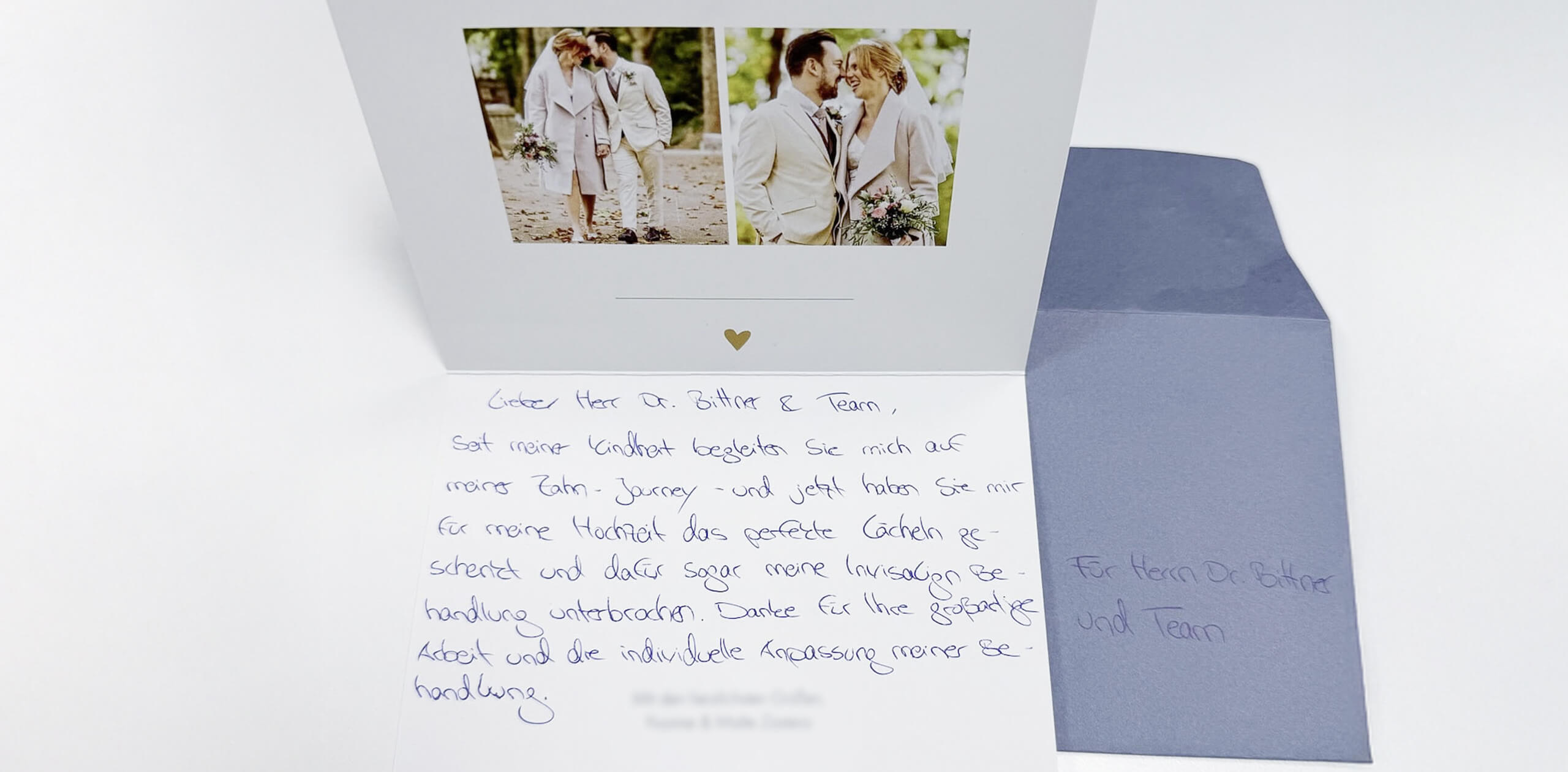Für ihre Hochzeit wurde die Invisalign-Behandlung kurz pausiert – rechtzeitig zum großen Tag saß jedes Detail perfekt. In einer liebevollen Karte bedankte sich die Patientin für die einfühlsame Begleitung und das herausragende Ergebnis.
