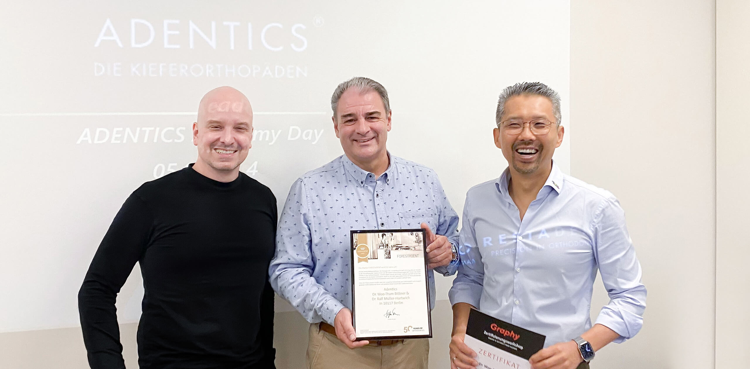 Letzte Woche haben unsere Geschäftsführer wie schon im letzten Jahr die „Goldkunde“ Urkunde von FORESTADENT International überreicht bekommen. Seit vielen Jahren bestellen wir bei Forestadent einen Großteil unserer Materialien für die festen und herausnehmbaren Spangen. Als ehemaliger Schmuckhersteller und seit über 100 Jahren international tätiger Lieferant für deutsche Qualitätsprodukte hat Forestadent das bei ADENTICS-Patient*innen u.a. sehr beliebte Microbracket im Programm, das kleinste Bracket für feste Spangen weltweit. Wir freuen uns sehr über die gute Zusammenarbeit und sagen Danke!